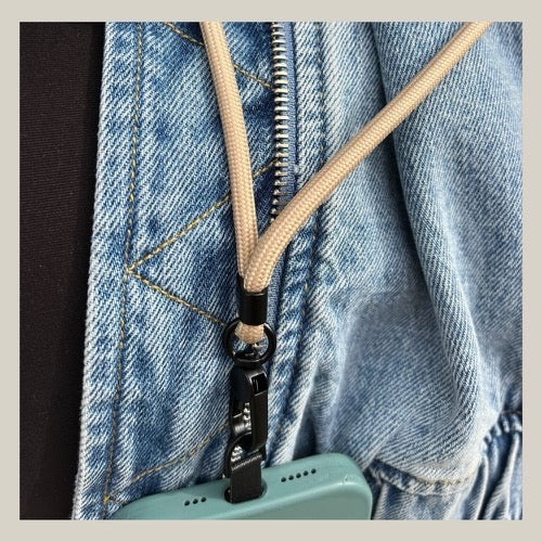 Das 160 cm lange, verstellbare Band ist aus reißfestem Kordel gefertigt und mit robusten schwarzen Stahlelementen versehen. Ob beim Einkaufen, Spazierengehen oder auf Reisen – dein Handy bleibt angenehm an deiner Seite.